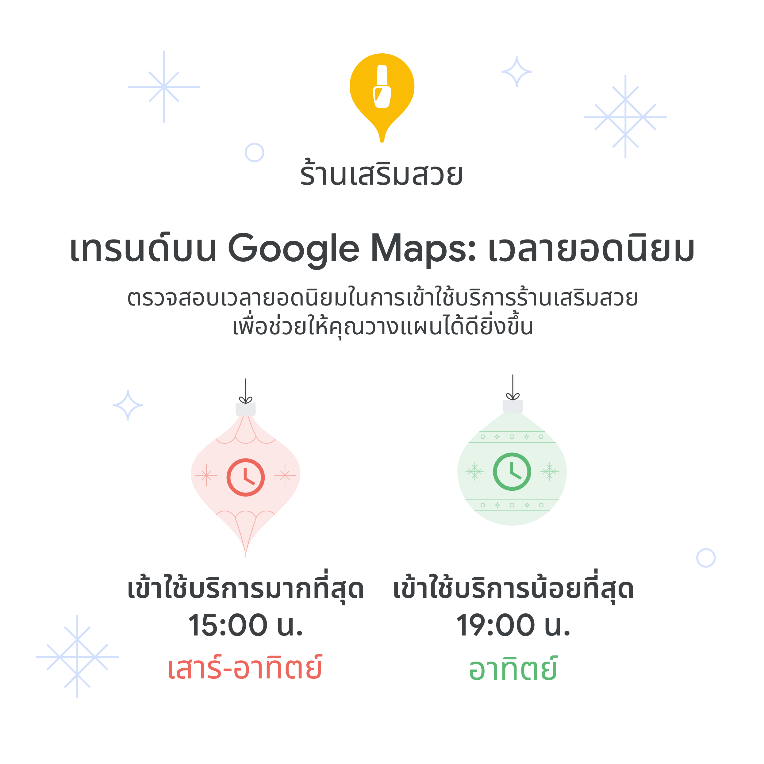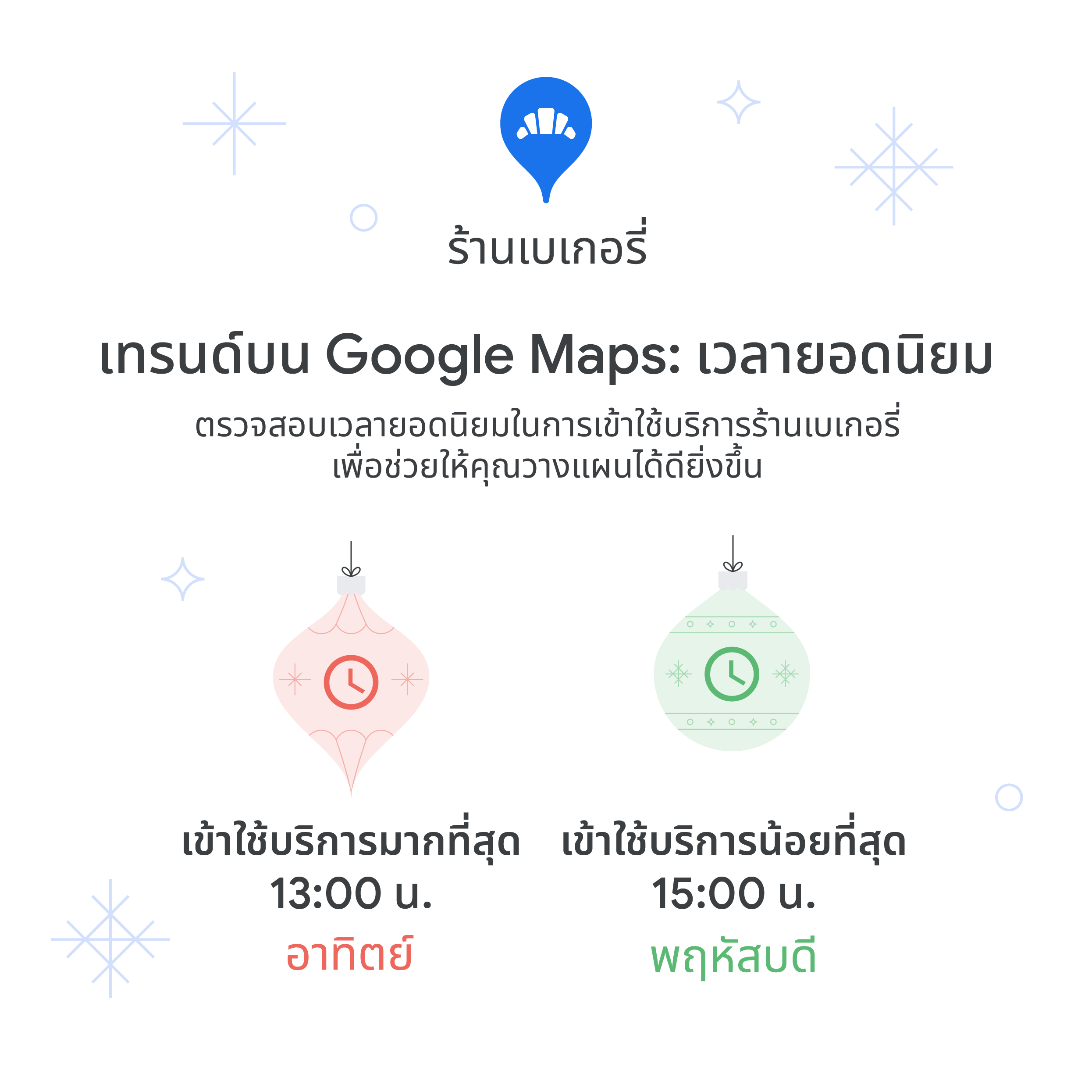 Google เปิดเผยข้อมูลเกี่ยวกับเทรนด์ต่างๆ ที่น่าสนใจบน Google Maps ที่สะท้อนให้เห็นถึงภาพรวมของประเทศไทยที่ในปีนี้ยังเป็นอีกหนึ่งปีที่ผู้คนยังใช้ชีวิตแบบนิวนอร์มอล ในขณะที่ผู้คนยังคงค้นหาสถานที่ต่างๆ เพื่อทำกิจกรรมในช่วงเทศกาล วันหยุดยาวที่กำลังจะมาถึงนี้ และ Google ได้รวบรวมข้อมูลเกี่ยวกับเทรนด์การค้นหาบน Google Maps ของผู้ใช้งานในประเทศไทยในช่วงเวลาที่แตกต่างกัน ไม่ว่าจะเป็นช่วงเวลาที่ผู้คนนิยมเข้าใช้บริการตามสถานที่ต่างๆ ไปจนถึงประเภทอาหารที่คนไทยนิยมค้นหามากที่สุด โดยข้อมูลดังกล่าวจะช่วยให้ทุกคนสามารถวางแผนการทำกิจกรรมต่างๆ ล่วงหน้าได้ดียิ่งขึ้น รวมทั้ง ใช้เวลาในการเฉลิมฉลองช่วงเทศกาลวันหยุดปีนี้ได้อย่างปลอดภัยและมีความสุข