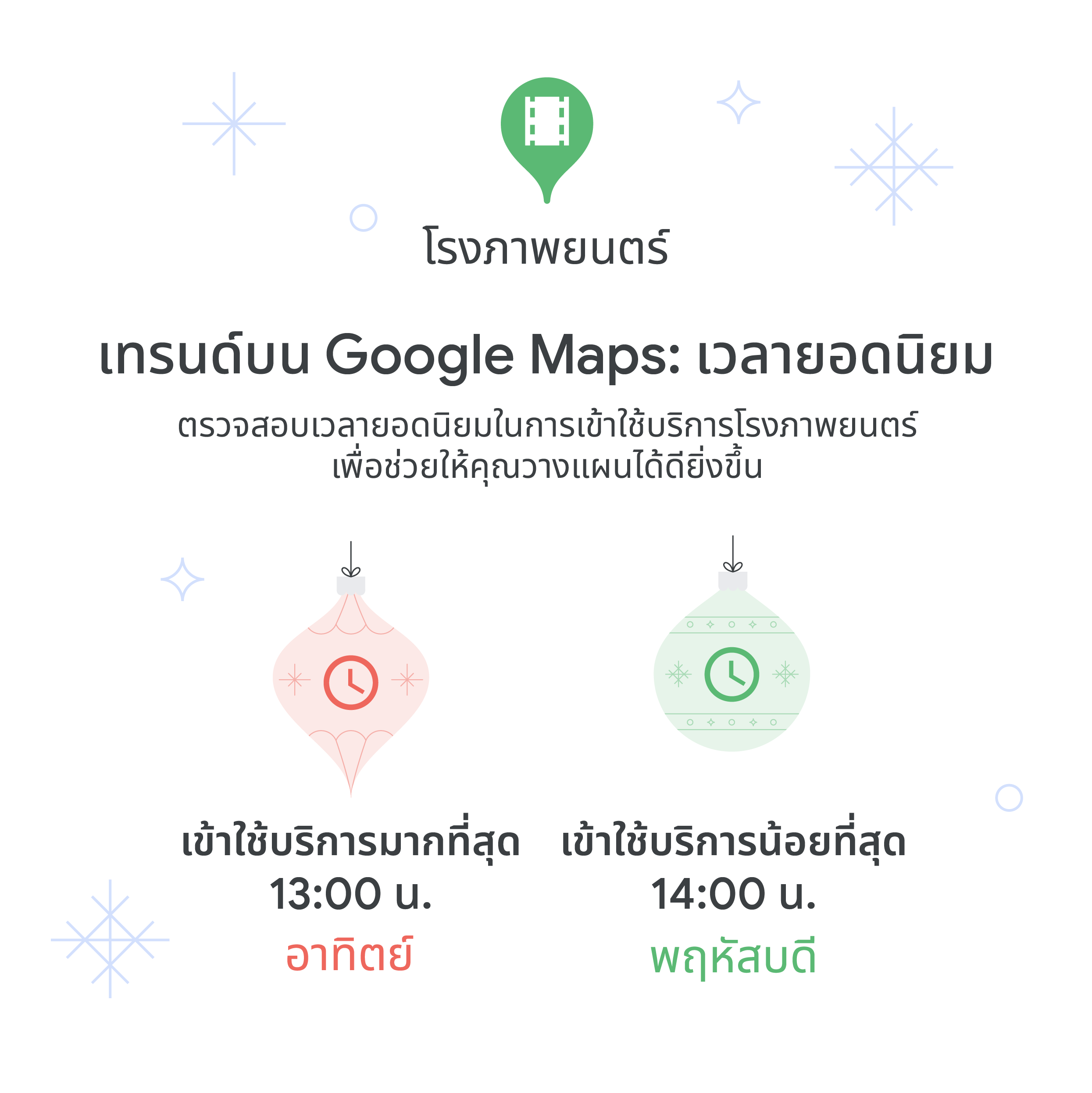 สำหรับการค้นหาสถานที่เพื่อใช้เวลาในช่วงเทศกาล Google Maps ได้รวบรวมรายชื่อสถานที่ที่ผู้คนค้นหาเป็นอันดับต้นๆ ในปีนี้ หลักๆ ได้แก่ ศูนย์แสดงสินค้า โรงภาพยนตร์ สถานที่ท่องเที่ยว พิพิธภัณฑ์ และหอศิลป์