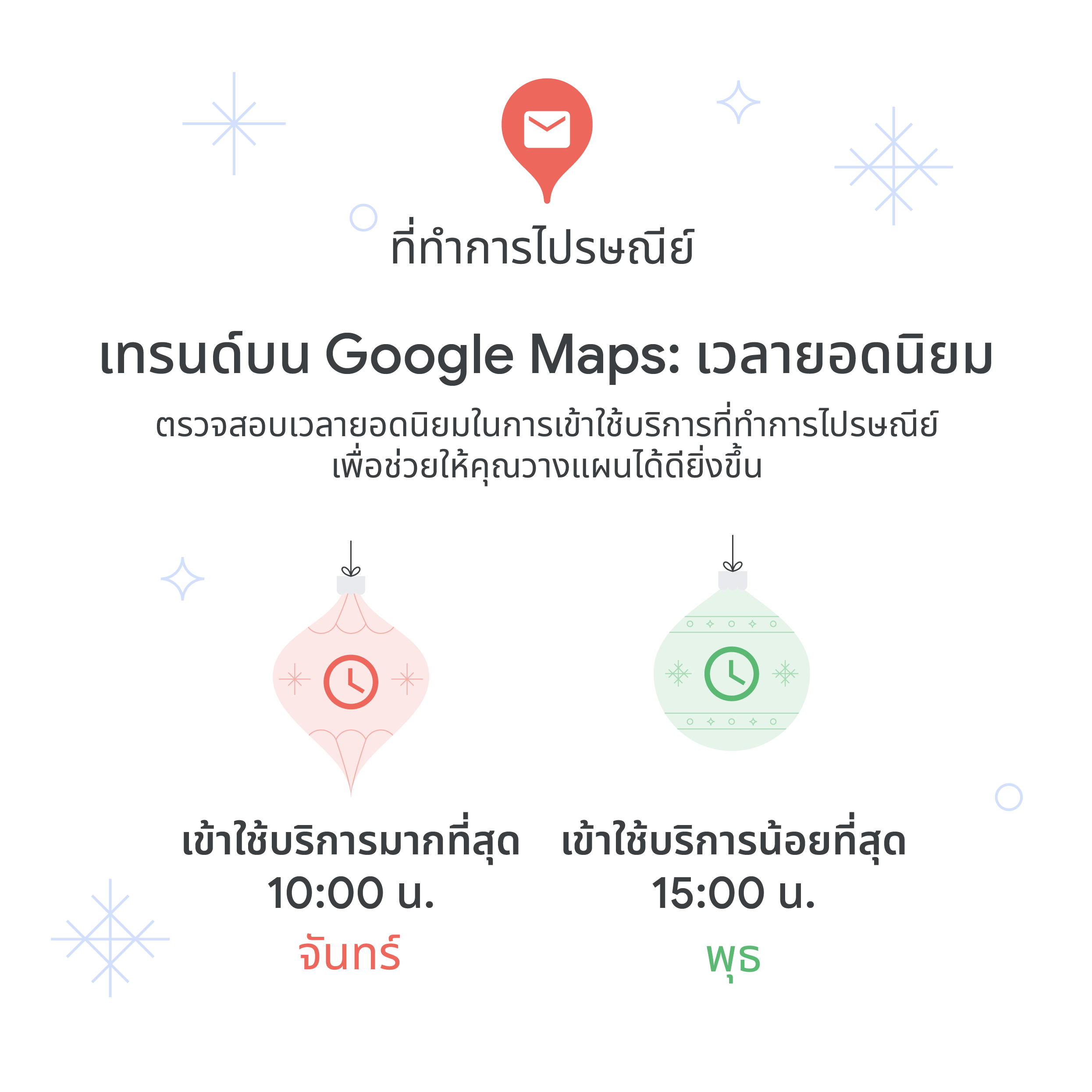 เพื่อการวางแผนสำหรับเทศกาลวันหยุดยาวที่จะถึงนี้ รวมไปถึงเพื่อให้การเดินทางไปยังสถานที่เหล่านี้ใช้เวลาน้อยและหลีกเลี่ยงการแออัด ผู้ใช้งานสามารถตรวจสอบเวลายอดนิยมในการเข้าใช้บริการสถานที่ต่างๆ นี้เพื่อช่วยให้วางแผนการเดินทางและใช้บริการได้ดียิ่งขึ้น เพื่อได้ใช้เวลากับครอบครัว ลาหยุดเพิ่มเติม หรือทำกิจกรรมเพื่อสร้างแรงบันดาลใจเพิ่มเติมระหว่างลาพักร้อน Google หวังว่าข้อมูลและเทรนด์เหล่านี้จะช่วยให้ผู้คนมีวันหยุดพักผ่อนที่เต็มเปี่ยมไปด้วยความสุขอย่างแท้จริง
