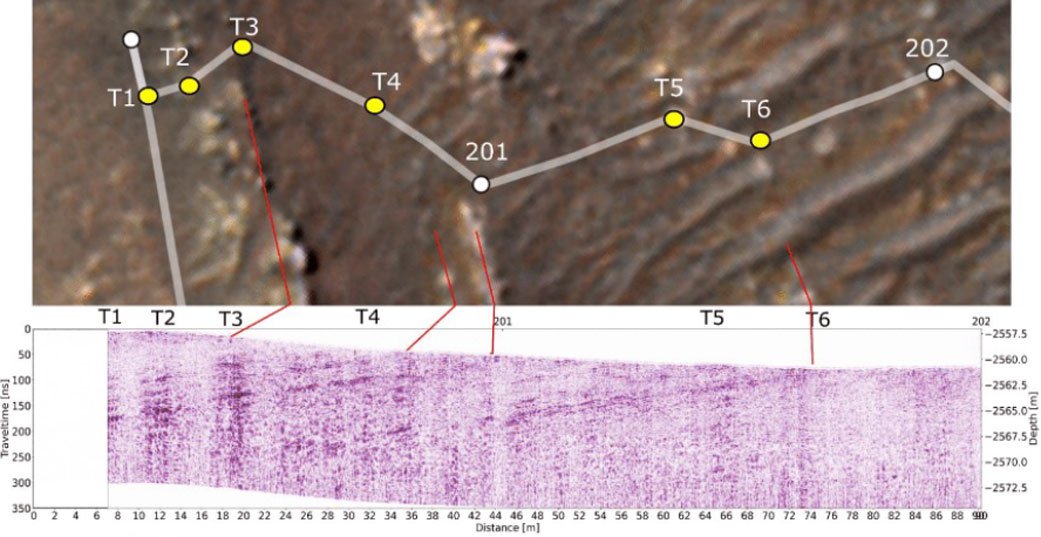 จากภาพ: ผลสแกนชั้นหินใต้ผิวดินแสดงให้เห็นลักษณะการก่อตัวของหินชั้นที่เกิดจากการตกตะกอน
