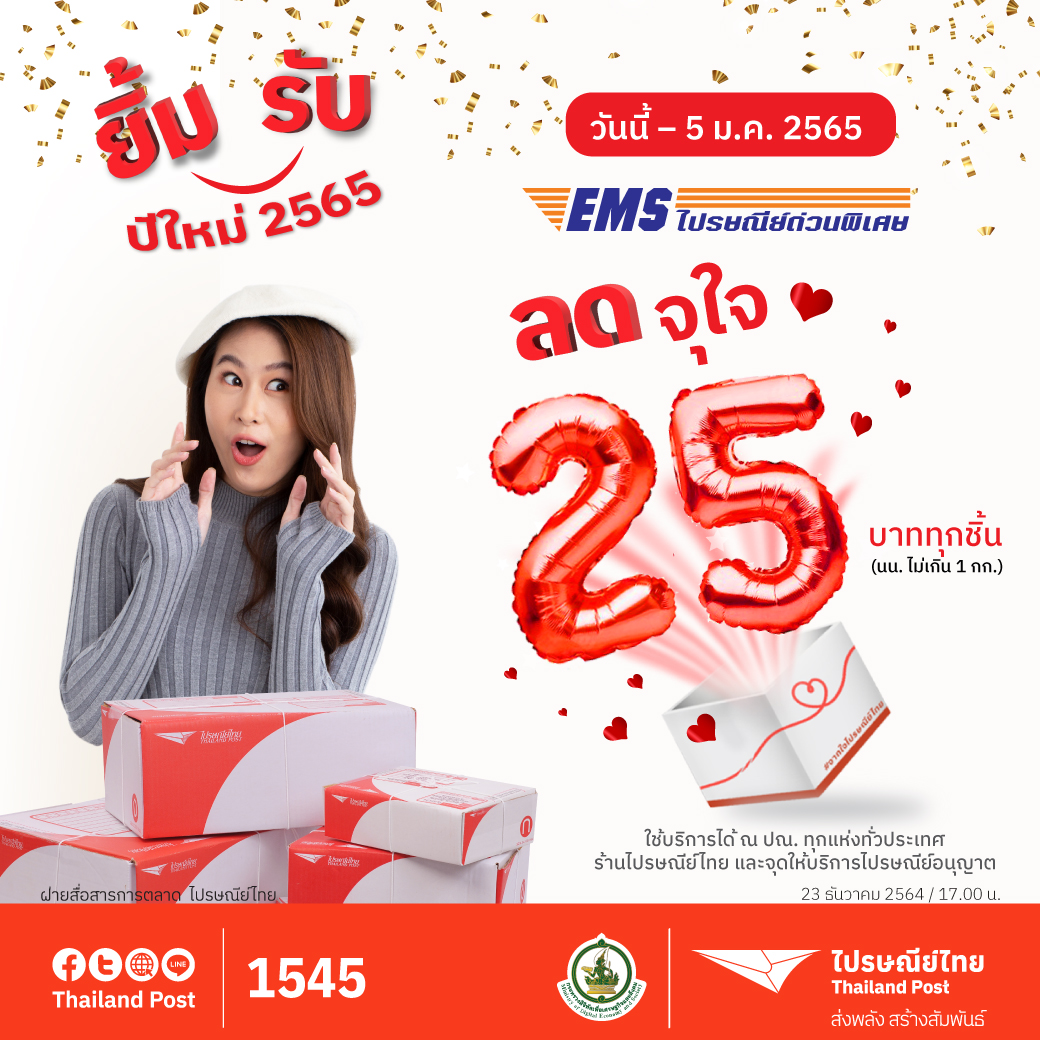 บริษัท ไปรษณีย์ไทย จำกัด เดินหน้าเชื่อมความสัมพันธ์ และเป็นสื่อกลางในการส่งความสุขเพื่อให้คนไทยทั่วประเทศได้เริ่มต้นปีใหม่พร้อมรอยยิ้ม กับโปรโมชัน “ยิ้มรับปีใหม่ 2565” ประหยัดค่าส่ง ผ่านบริการ EMS ไปรษณีย์ด่วนพิเศษในประเทศ ในอัตราเหมาจ่ายเพียง 25 บาท สำหรับสิ่งของน้ำหนักไม่เกิน 1 กิโลกรัม เพื่อเป็นของขวัญแก่คนไทยทั่วประเทศ นอกจากนี้ ยังสามารถใช้บริการเสริมเรียกเก็บเงินปลายทาง (COD) สูงสุดไม่เกิน 50,000 บาท กับค่าธรรมเนียมในอัตรา 3% จัดส่งได้ตั้งแต่วันนี้ – 5 มกราคม 2565 ณ ที่ทำการไปรษณีย์ทุกแห่งทั่วประเทศ ร้านไปรษณีย์ไทย และจุดให้บริการไปรษณีย์อนุญาต