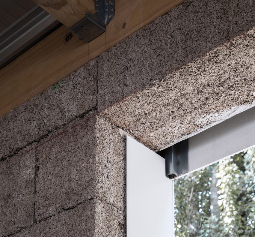 จากรูป: ภาพชัด ๆ ของ Hempcrete Block ซึ่งถ้าคนไม่ชอบ Texture ก็สามารถฉาบเรียบหรือตีฝ้าปิดได้
