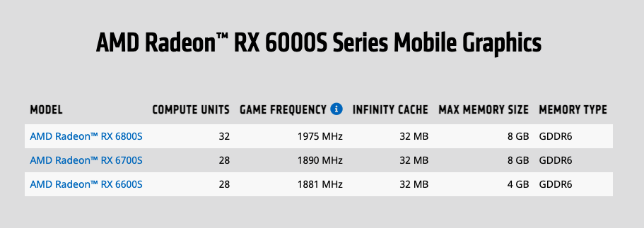 ส่วนการ์ดจอซีรีย์เก่าอย่าง AMD Readeon RX 6000M ก็มีการอัพเกรดเช่นกัน รอบนี้ AMD เพิ่มรุ่นท็อปเข้าไปอย่าง Radeon 6850M, รุ่นกลางคือ RX 6650M/6650M XT และรุ่นเล็ก RX 6500M, 6300M ที่ให้ประสิทธิภาพดีกว่าเดิมถึง 20%