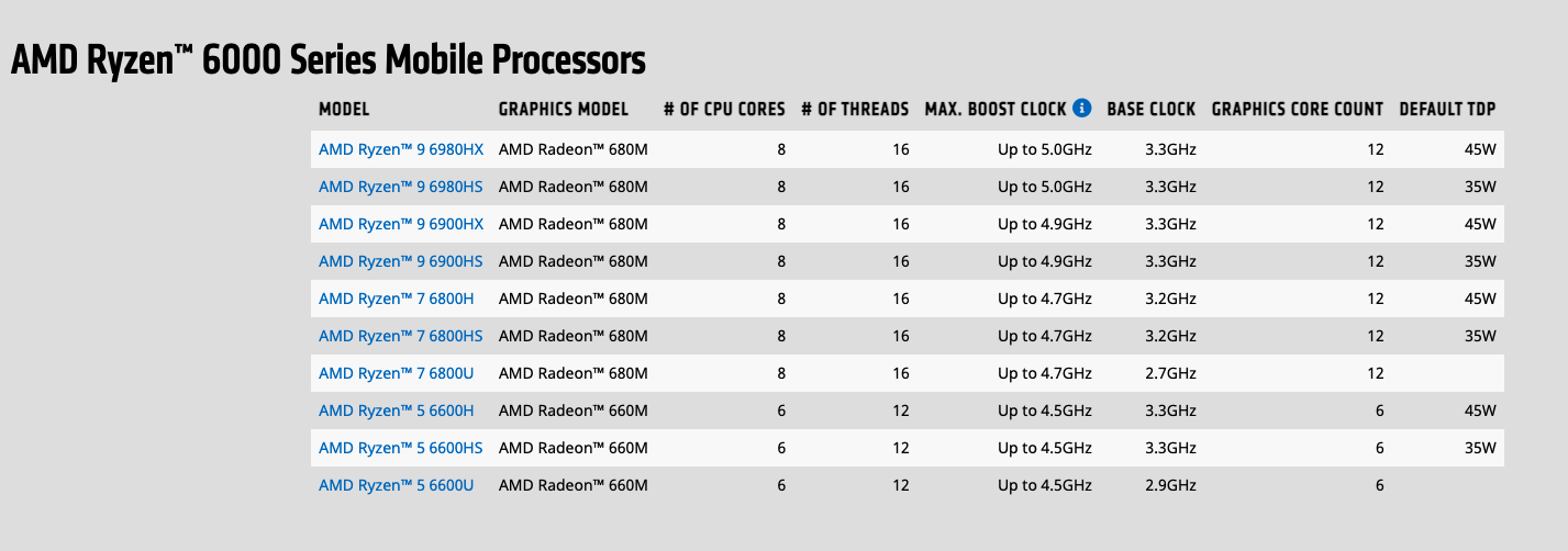 H-series นำโดย Ryzen 9 6980HX ซึ่งมาพร้อมกับ 8 cores 16 threads 3.3GHz ความถี่บูสต์สูงสุด 5GHz, รวมกับ L2 และ L3 Cache รวม 20 MB, GPU 12 cores ซึ่ง Ryzen 9 6980HX เป็น CPU ที่มี clockspeed ที่เร็วที่สุดของ AMD ตามที่ David McAfee รองประธานองค์กรและผู้จัดการทั่วไปของหน่วยธุรกิจลูกค้าของ AMD กล่าว
