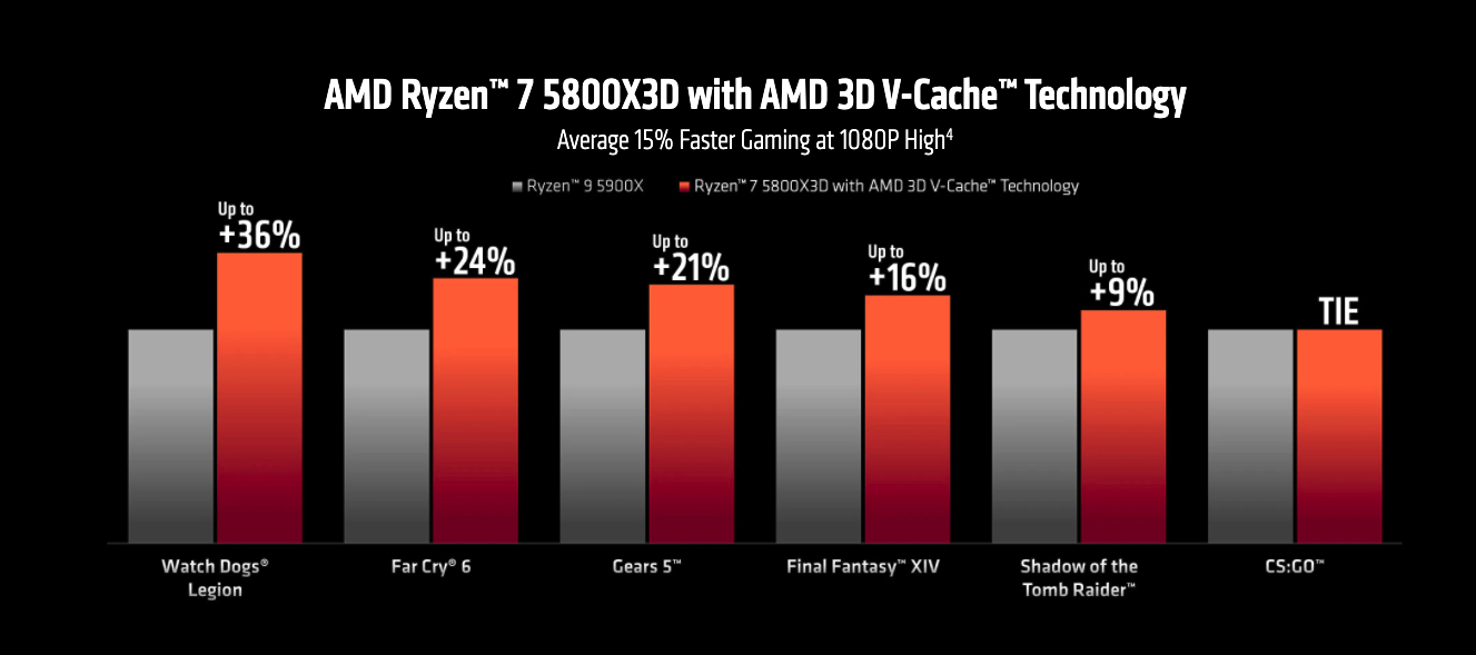 AMD ยังเปิดเผยว่า CPU Ryzen 7 รุ่นต่อไปใหม่ว่าจะเป็น “ชิปเล่นเกมที่เร็วที่สุดในโลก” ด้วยการใช้เทคโนโลยีชิพเล็ต 3-D ในรุ่น Ryzen 7 5800X3D ซีพียูซ็อกเก็ต AM4 อาศัย 3D V-Cache ที่อาศัยการวางชิปซ้อนกัน และยังใส่แคชมาให้มากถึง 32MB + 64MB (V-Cache) ให้ประสิทธิภาพการเล่นเกมเร็วขึ้นโดยเฉลี่ย 15 เปอร์เซ็นต์เมื่อเทียบกับ Ryzen 9 5900X ที่เป็นรุ่นบนๆของ AMD