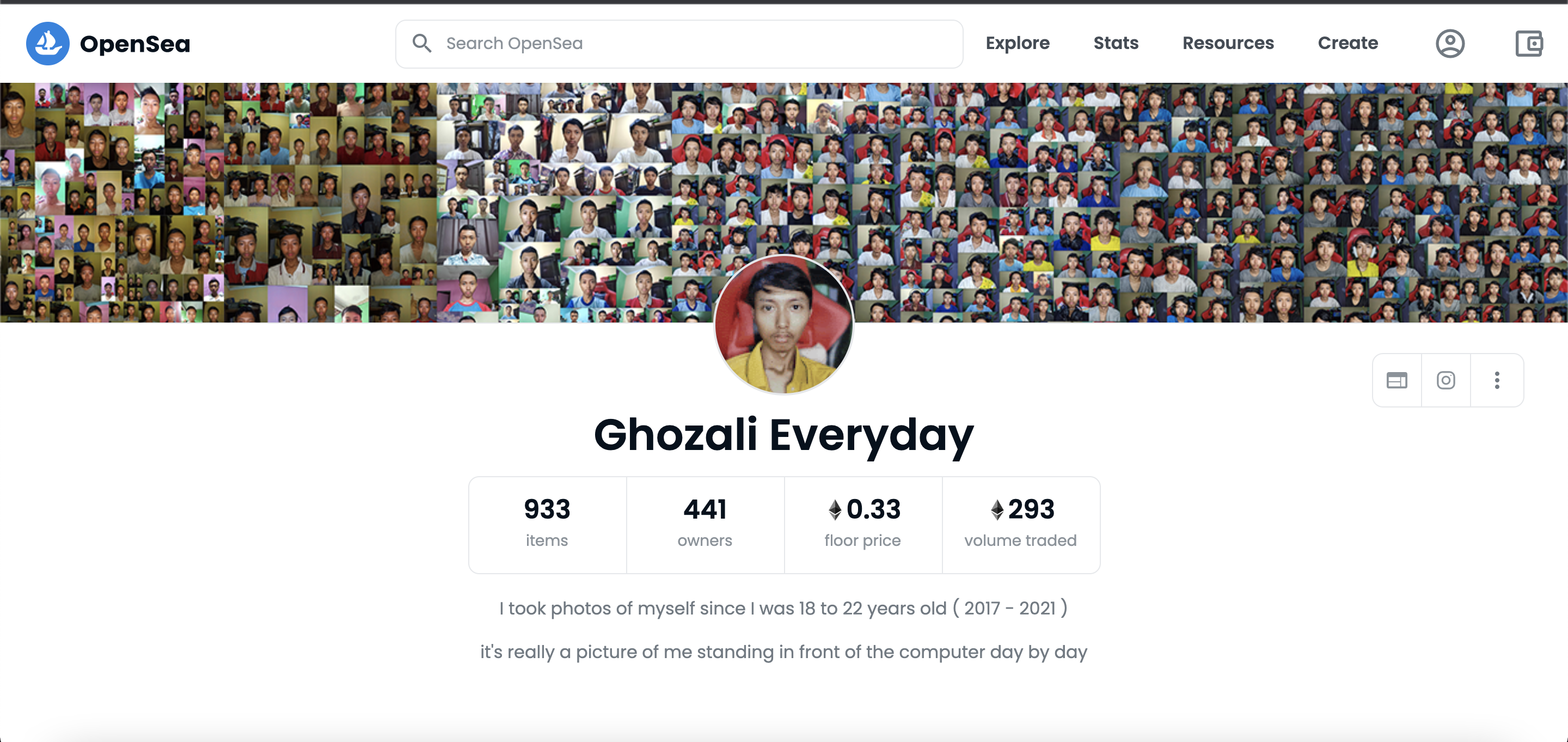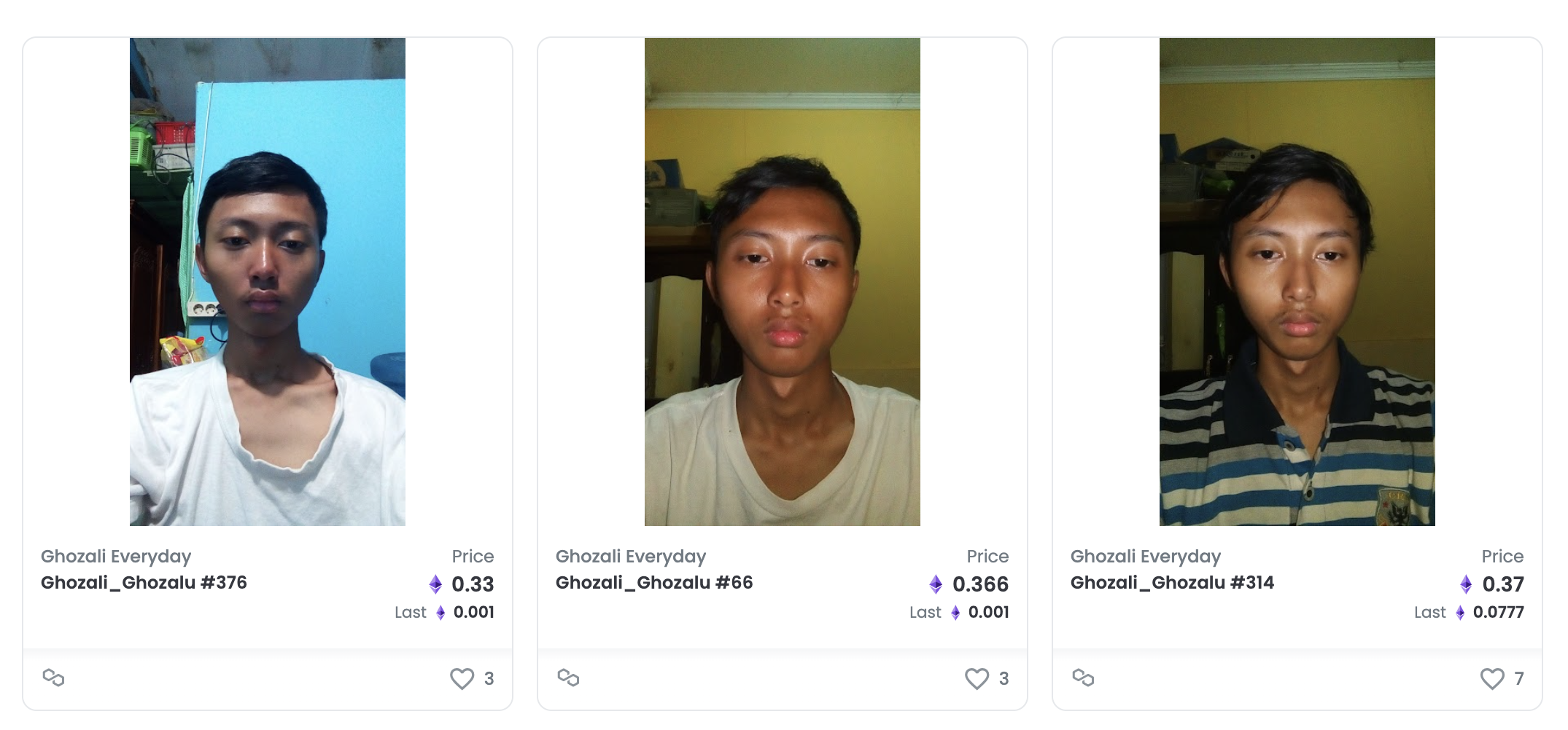 คอลเล็กชันนี้มีชื่อว่า “Ghozali Everyday” ประกอบไปด้วยรูปภาพเซลฟี่ที่เขาถ่ายตัวเองทุกวันตั้งแต่อายุ 18 ปีจนถึง 22 ปี จำนวน 933 ภาพ ซึ่งเขาเริ่มถ่ายตัวเองมาตั้งแต่ปี 2017 จนถึงปี 2021 ซึ่งภาพทั้งหมดนั้นจะเป็นภาพของตัวเขานั่งอยู่หน้าคอมพิวเตอร์ที่จุดเดิมทุกวันโดยมีการตั้งราคาขายไว้ที่ราคาเริ่มต้นภาพละ 0.001 ETH หรือเทียบเป็นเงินไทยประมาณ 108 บาท