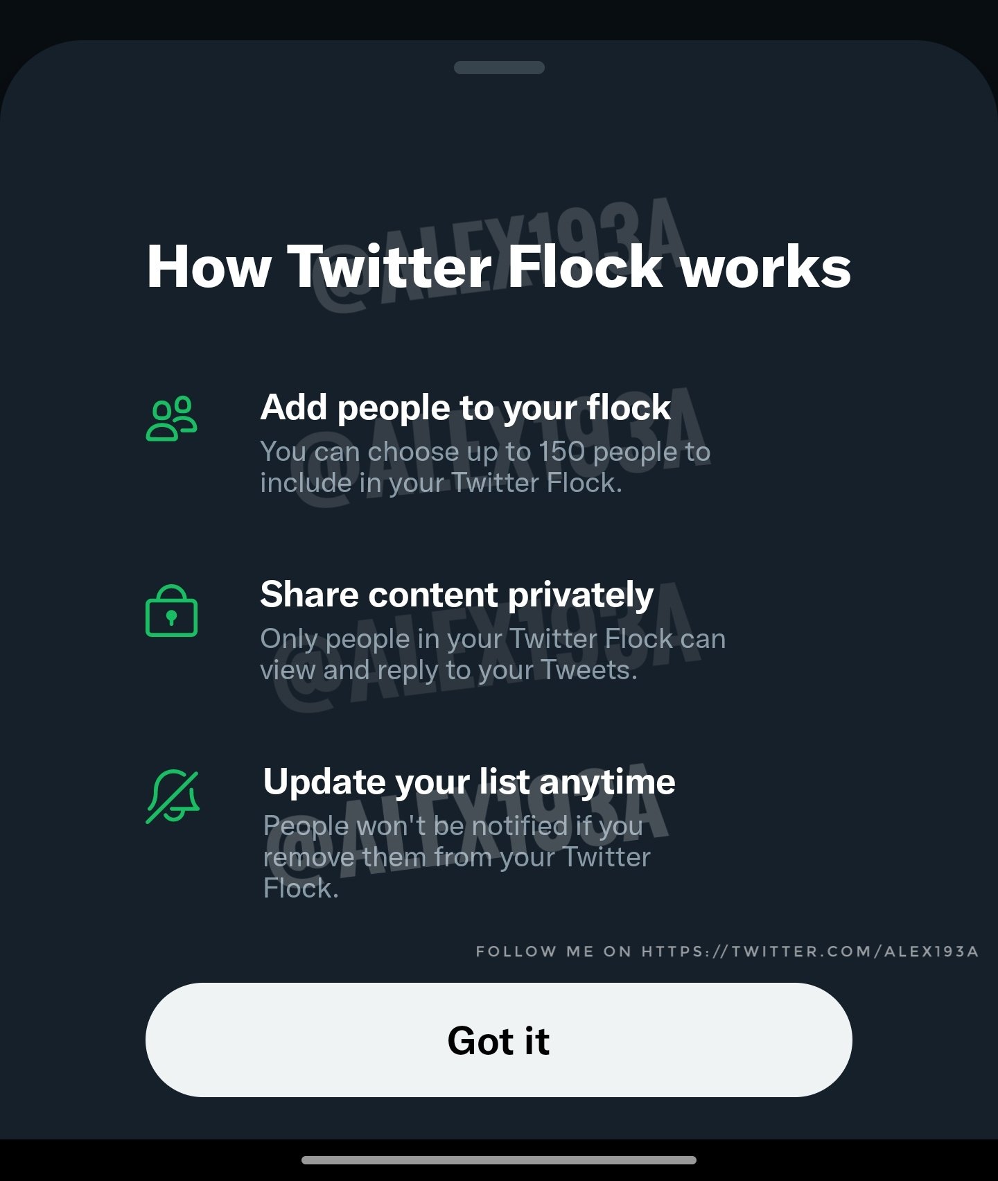 “Flock” ยังเป็นแค่ชื่อตัวอย่าง ยังไม่ใช่ชื่ออย่างเป็นทางการ โดยทวิตเตอร์จะเปิดให้เราเลือกเพิ่มรายชื่อผู้ใช้ได้สูงสุด 150 คน ซึ่งคนกลุ่มนี้จะสามารถมองเห็นและตอบกลับทวีตที่เราส่งเข้าไปในกลุ่มได้ ระบบจะส่งการแจ้งเตือนเพื่อแจ้งให้รู้ว่ามีข้อความส่งมา แถมเรายังสามารถแก้ไขรายชื่อคนในกลุ่มได้ตลอดเวลา แถมคนที่ถูกถอดออกไปก็จะไม่มีการแจ้งเตือนให้รู้ว่าออกจากกลุ่มแล้ว ซึ่งแนวคิดก็คล้ายๆกับ Close Friends for Stories ของ Instagram