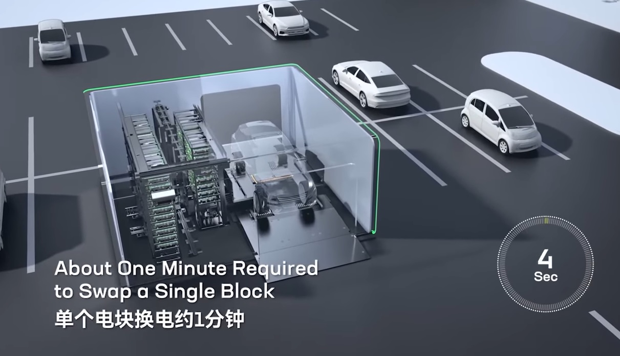 และในการเปลี่ยนแบตเตอรี่นั้นก็ทำโดยเครื่องจักรอัตโนมัติโดยไม่ต้องใช้พนักงานเปลี่ยน เพียงลูกค้าวิ่งรถเข้าไปบนแท่นเปลี่ยน สั่งการผ่าน App ระบบก็จะดำเนินการนำเอาแบตเตอรี่ที่ไฟหมดออกและนำแบตเตอรี่แพ็คใหม่เปลี่ยนเข้าให้เมื่อเสร็จลูกค้าก็สามารถขับรถออกไปได้เลย โดยกระบวนการทั้งหมดนี้ใช้เวลาเพียง 1 นาทีต่อการเปลี่ยนแบตเตอรี่ 1 แพ็ค (เร็วกว่าเติมน้ำมันตามปั๊มปัจจุบันอีก) ซึ่งเมื่อเทียบกับเทคโนโลยี Supercharge ของ Tesla ที่ใช้เวลาชาร์จ 15 นาทีได้ระยะทางวิ่ง 200 กิโลเมตร การเปลี่ยนแบตเตอรี่แพ็คเอาเลยแบบนี้ย่อมดูน่าสนใจกว่าเยอะในมุมมองผู้ใช้รถ EV
