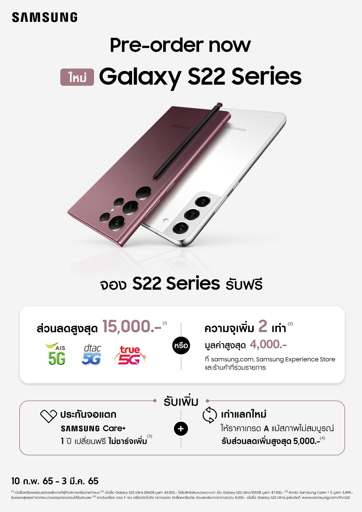 พิเศษสำหรับช่วงพรีออเดอร์ระหว่างวันนี้ – 3 มีนาคม 2565 กับส่วนลดสูงสุดถึง 15,000 บาทเมื่อจองผ่าน AIS DTAC และ TRUE หรือ รับฟรีความจุเพิ่ม 2 เท่า มูลค่าสูงสุด 4,000 บาท พร้อมประกันจอแตก 1 ปี ไม่มีชาร์จเพิ่มมูลค่า 3,499 บาท ยิ่งกว่านั้น กับแคมเปญเก่าแลกใหม่ ให้ราคาเกรด A และรับส่วนลดเพิ่มจากราคาประเมิน 5,000 บาท แม้สภาพไม่สมบูรณ์อีกด้วย เมื่อจองผ่าน samsung.com, Samsung Experience Store และร้านค้าที่ร่วมรายการ พิเศษรับเพิ่ม! เครดิตเงินคืนสูงสุด 20% ผ่านบัตรเครดิต SCB และ e-voucher มูลค่า 1,000 บาท เฉพาะที่ samsung.com, Samsung Experience Store เท่านั้น