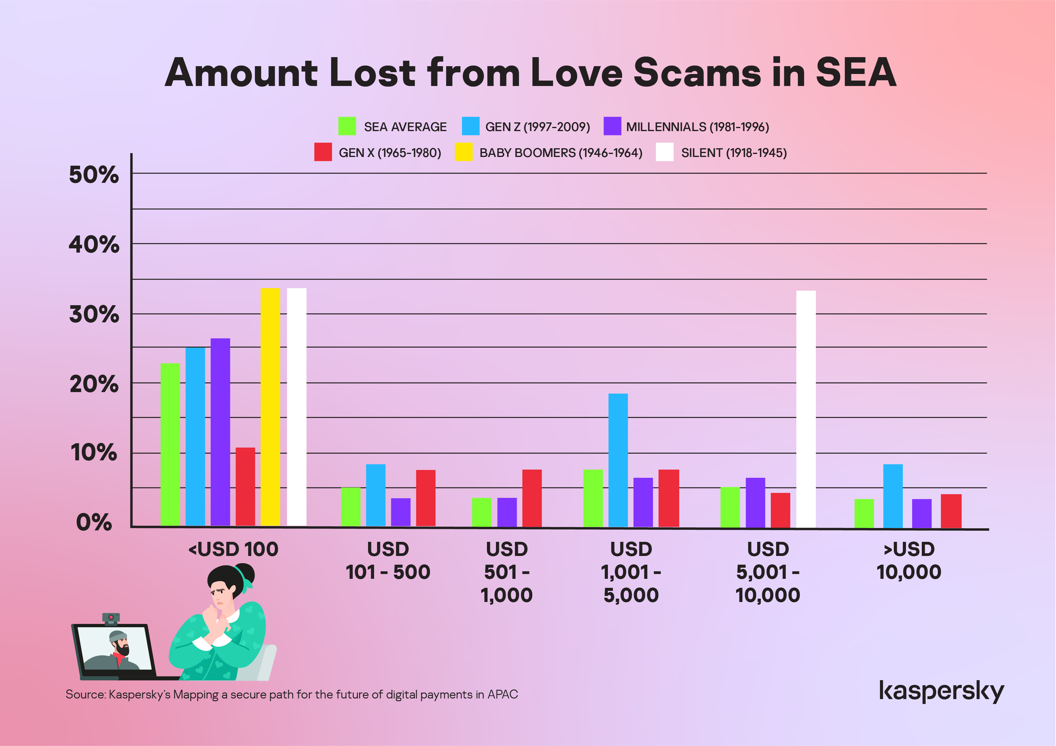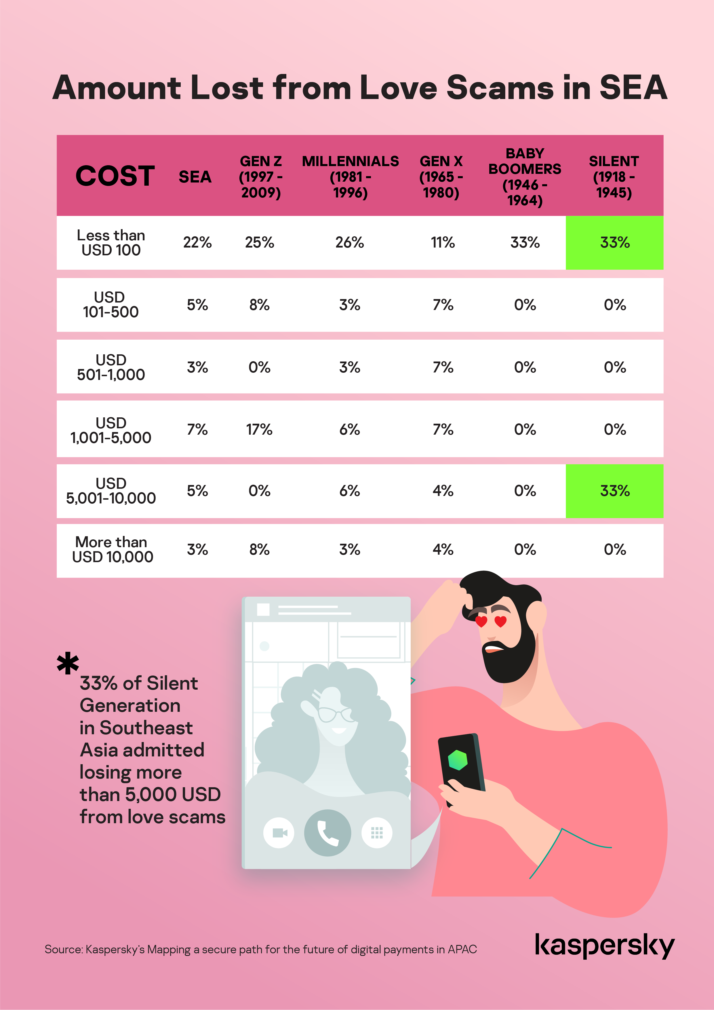 การวิจัยของแคสเปอร์สกี้อีกหนึ่งเรื่องชื่อ “Mapping a secure path for the future of digital payments in APAC” เปิดเผยว่าผู้ตอบแบบสอบถามจำนวนเกือบหนึ่งในสอง (45%) ในเอเชียตะวันออกเฉียงใต้ สูญเสียเงินเนื่องจากการถูกหลอกลวงเรื่องความรักทางออนไลน์