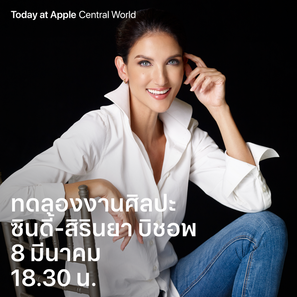 ลงทะเบียนเข้าร่วมกิจกรรม ทดลองงานศิลปะกับ ซินดี้–สิรินยา บิชอพ ซึ่งจะจัดขึ้นในวันอังคารที่ 8 มีนาคม เวลา 18.30 – 20.30 น. ที่ Apple Central World ได้ที่https://apple.co/3IdGR7y