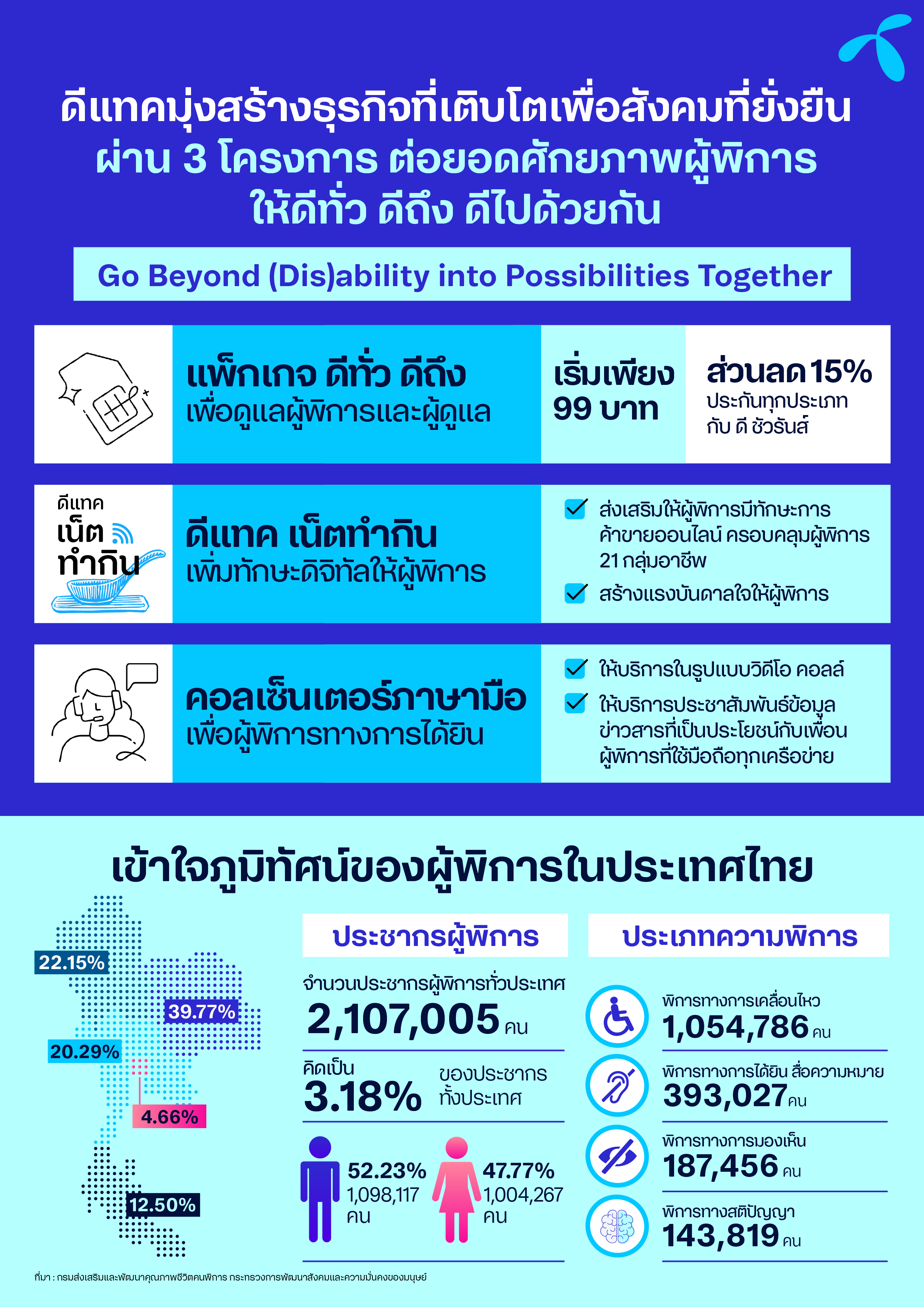 ดีแทคเปิดแผนธุรกิจเพื่อสังคมที่ยั่งยืน ภายใต้แนวคิด Go Beyond (Dis) abilities into possibilities together ต่อยอดศักยภาพผู้พิการ พลิกการขาดหาย ให้กลายเป็นพลังใหม่ พร้อมพาทุกชีวิต “ดีทั่วดีถึง ดีไปด้วยกัน ทุกคน” ประกาศความร่วมมือกับกรมส่งเสริมและพัฒนาคุณภาพชีวิตคนพิการ และสมาคมคนหูหนวกแห่งประเทศไทย ขับเคลื่อนด้านการส่งเสริมและพัฒนาคุณภาพชีวิตคนพิการผ่าน 3 โครงการหลัก คือ