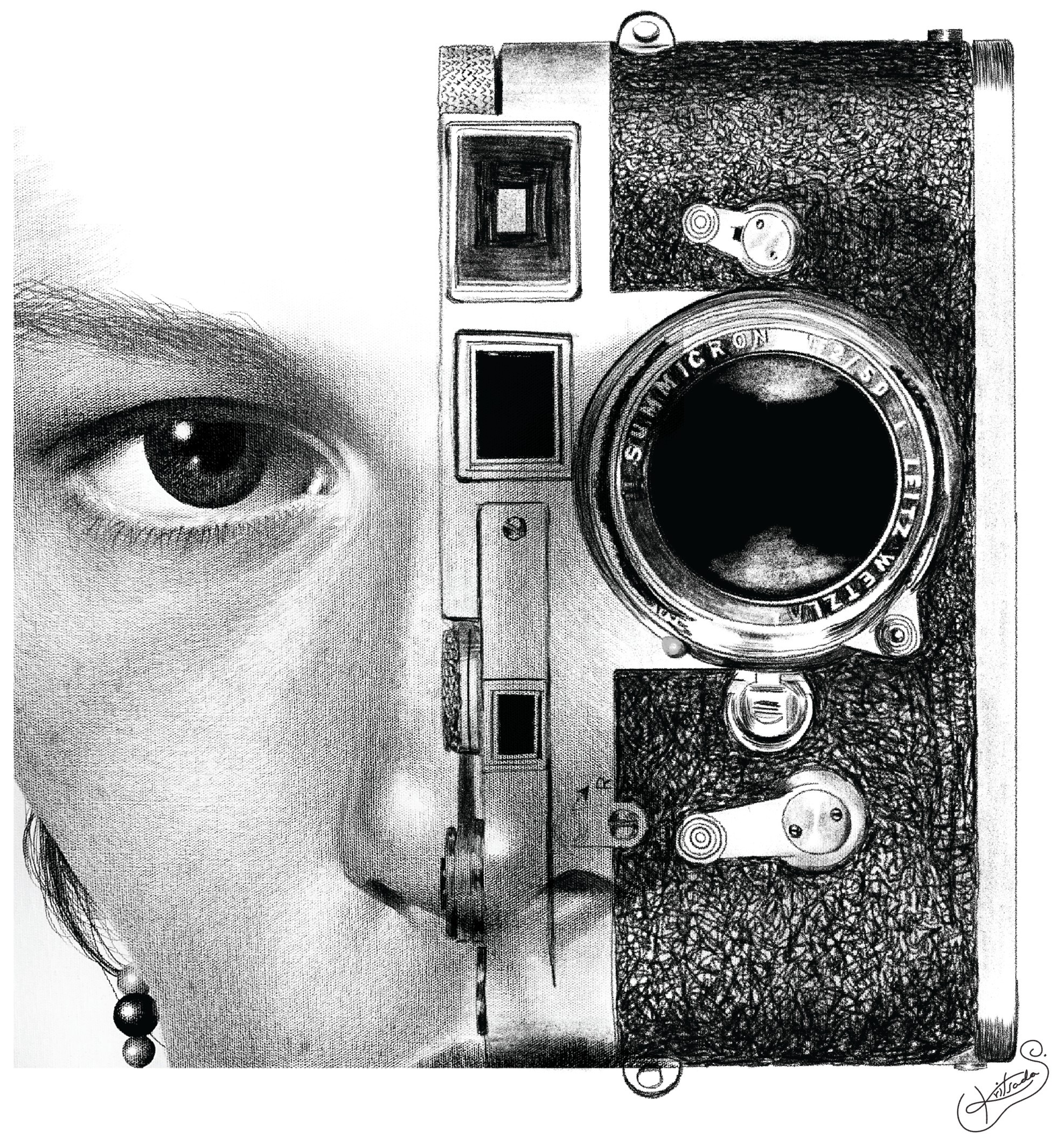 ตามมาด้วยลายที่ 2 เป็น “ภาพใบหน้าที่มีกล้องไลก้าทาบอยู่ครึ่งหนึ่ง” ต้องการสื่อว่าเมื่อยก