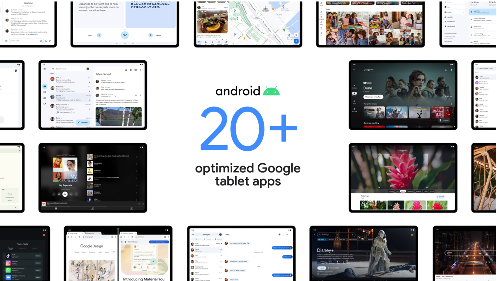 ฝั่งของแท็บเล็ตก็มีการปรับอินเทอร์เฟซให้รองรับการแสดงผลบนจอขนาดใหญ่ให้เห็นชัดเจนขึ้น มีการเพิ่มฟีเจอร์ใหม่เพื่อให้ทำงาน multitask ได้ดีขึ้น เช่น Toolbar ด้านล่างเพื่อให้เรียกใช้แอปได้เร็วขึ้น รวมถึงมีการปรับการทำงานของแอปกว่า 20 แอปให้ทำงานบนจอแท็บเล็ตได้ดีขึ้น เช่น YouTube Music, Google Maps, Messages, TikTok, Zoom, Facebook ส่วน Google Play ก็จะปรับโฉมเช่นกัน รวมถึงค้นหาแอปที่ปรับแต่งให้เข้ากับจอแท็บเล็ตได้ง่ายขึ้น