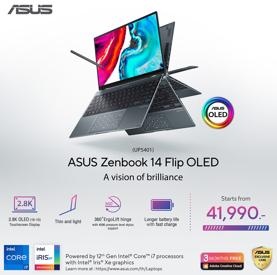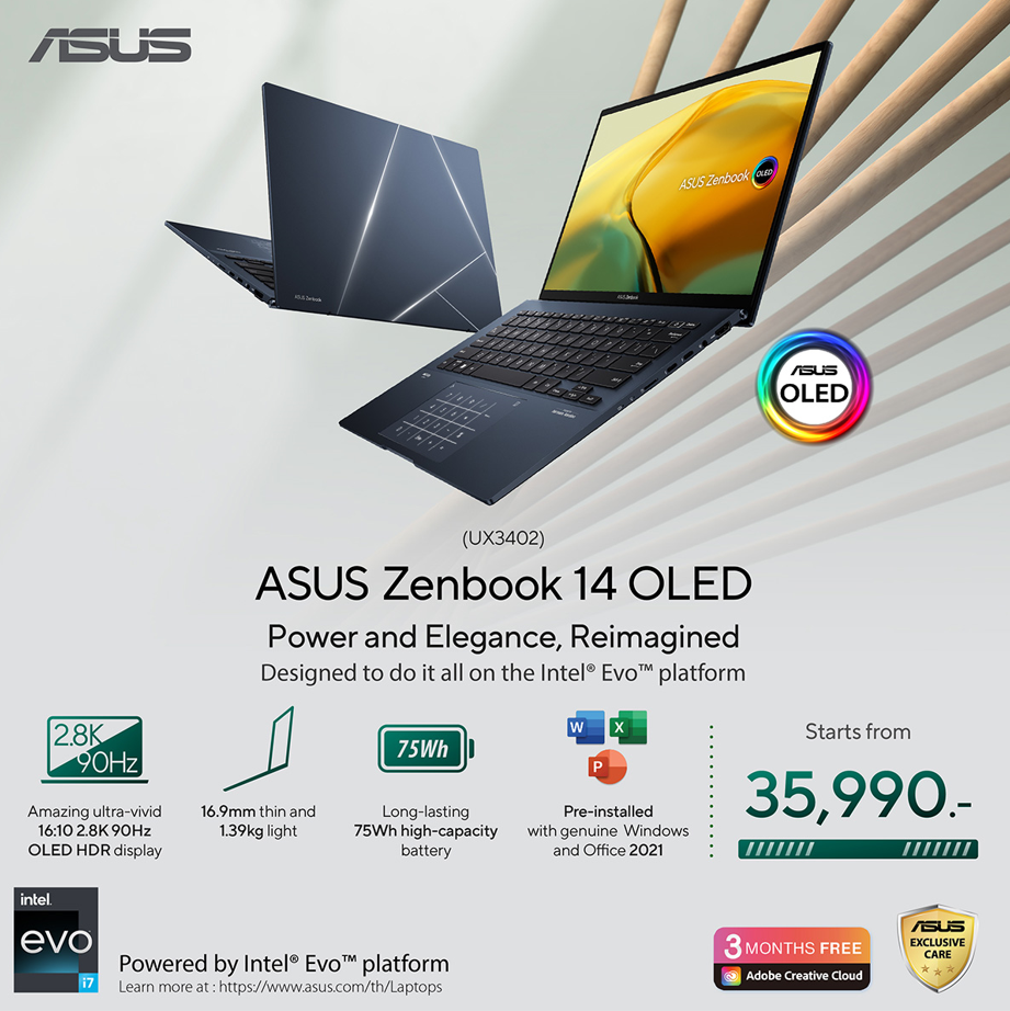 - UX3402ZA-KM701WS : Intel® Core™ i7-1260P / 16GB LPDDR5 on board/ 1TB M.2 NVMe™ PCIe® 4.0 Performance SSD/ Intel® Iris Xe Graphics/ / 14.0-inch 2.8K (2880 x 1800) OLED 16:10 aspect ratio/ 1.39 kg/ Office Home and Student 2021 included/ Three-Month Membership of Adobe Creative Cloud All Apps ราคา 43,990 บาท