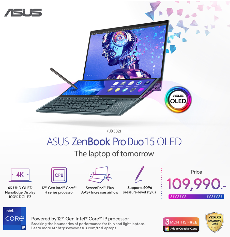 ASUS Zenbook 14 OLED (UX3402), ASUS Zenbook Pro Duo 15 OLED (UX582ZM) และ ASUS Zenbook 14 Flip OLED (UP5401ZA) วางจำหน่ายแล้วตั้งแต่วันนี้เป็นต้นไป มาพร้อมการรับประกัน ASUS Exclusive Care ครอบคลุมการบริการซ่อมถึงที่ (on-site service) 3 ปี, ประกันระหว่างประเทศ 57 ประเทศทั่วโลก และประกันอุบัติเหตุ (Perfect Warranty) 1 ปีเต็ม พร้อมด้วย Windows 11 และ Pre-installed Office Home & Student 2021 ติดตั้งพร้อมใช้งานตลอดอายุเครื่อง พร้อมรับสมาชิก Adobe Creative Cloud® ฟรี เป็นระยะเวลาสามเดือน