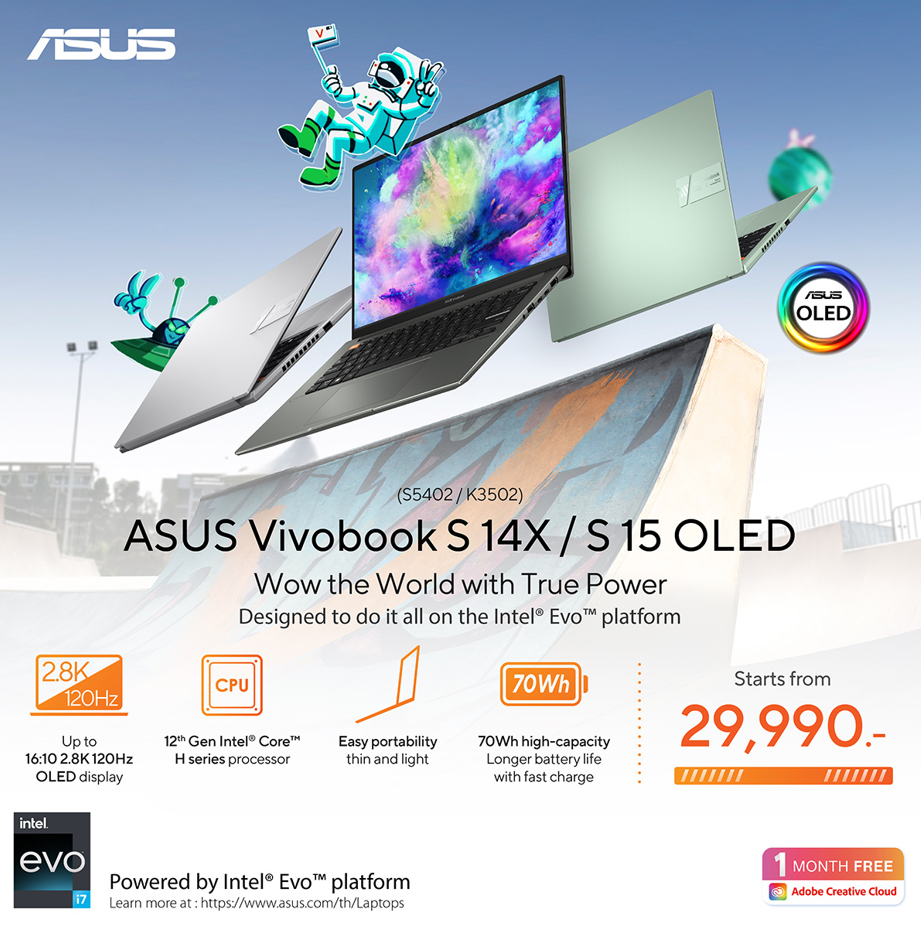 - S5402ZA-M9501WS : Intel® Core™ i5-12500H/ 8GB DDR4 on board + 8GB DDR4 SO-DIMM/ 512GB M.2 NVMe™ PCIe® 4.0 SSD/ Intel® Iris Xe Graphics/ / 14.5-inch 2.8K (2880 x 1800) OLED 16:10 aspect ratio/ 1.63 kg/ Office Home and Student 2021 included/ One-Month Membership of Adobe Creative Cloud All Apps ราคา 30,990 บาท