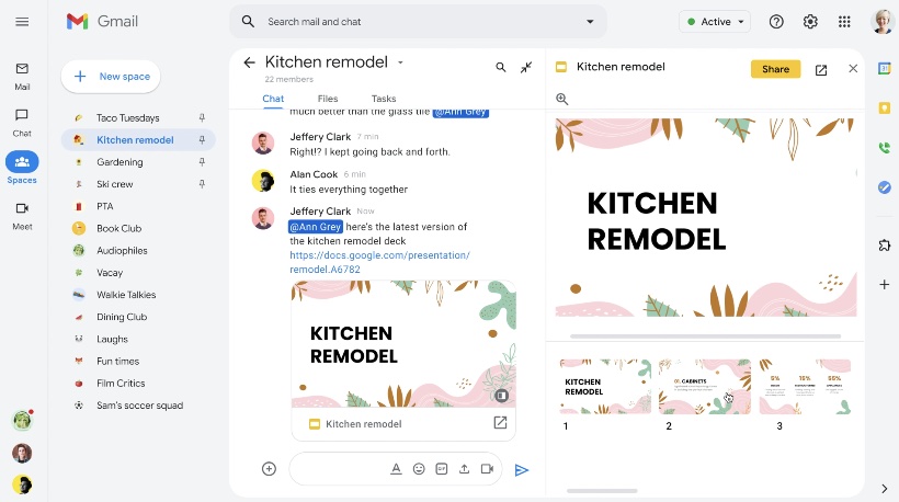 ในช่วงหลายปีที่ผ่านมา Gmail ก็มีการปรับโฉมมาอย่างต่อเนื่อง ด้วยการผสาน Inbox, Spaces, Meet และ Chat เข้าไปรวมในที่เดียว ส่วนการเปลี่ยนแปลงล่าสุดคือ เราสามารถแก้ไข Docs, Slides หรือ Sheets ในขณะที่คุยกับเพื่อนไปพร้อมๆกันได้