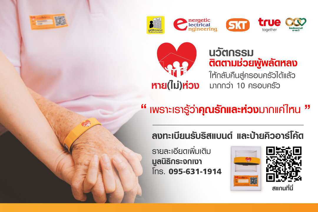 ความเสี่ยงในการพลัดหลงของผู้ป่วยที่มีอาการหลงลืม อาจเกิดขึ้นได้เสมอ ปัญหาเมื่อผู้ป่วยหลงลืม ที่พลัดหลงหายออกจากบ้าน จะไม่สามารถให้ข้อมูลเกี่ยวกับตัวเองได้ และมักไม่มีเอกสารติดตัว… กลุ่มทรู มูลนิธิกระจกเงา และภาคีเครือข่าย ได้แก่ บริษัท เอ็นเนอร์จีทิค อิเล็คทริคอล เอ็นจิเนียริ่ง จำกัด และ บริษัท เอสเคที. เอ็มบรอยเดอรี่ จำกัด จึงร่วมกันพัฒนา ริสแบนด์ และป้ายคิวอาร์ โค้ด สำหรับรีดติดเสื้อผ้า เพิ่มช่องทางและเป็นเครื่องมือในการติดตามคนหายที่มีประสิทธิภาพมากขึ้น
