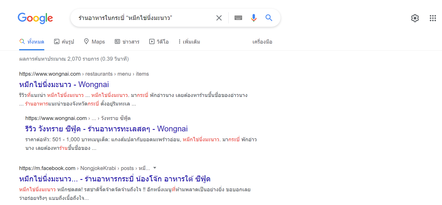 เช่น ร้านอาหารในกระบี่ “หมึกไข่นึ่งมะนาว” เว็บไซต์ที่มีร้านอาหารในกระบี่และคำว่า ‘หมึกไข่นึ่งมะนาว’ ก็จะโผล่ขึ้นมาแม่นยำกว่าเดิม