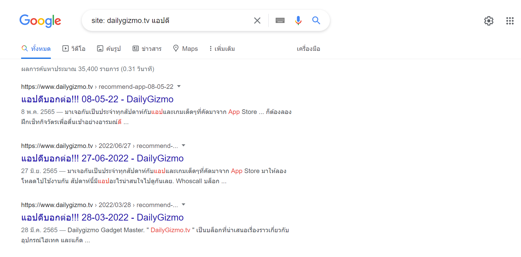 เช่น ต้องการค้นหา แอปดี จากเว็บไซต์ dailygizmo.tv ให้เราพิมพ์ว่า site: dailygizmo.tv แอปดี เนื้อหาที่ประกฏจะเกี่ยวกับแอปดีจากเว็บไซตื dailygizmo