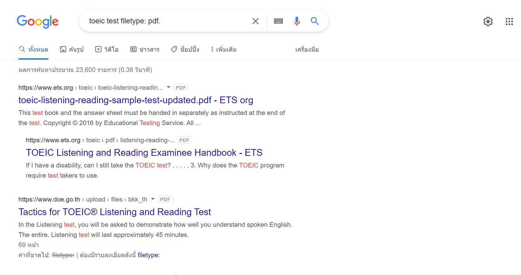 พิมพ์สิ่งที่เราต้องการค้นหาตามด้วย filetype: และประเภทไฟล์ เท่านี้เราก็ได้ไฟล์ที่เราต้องการอย่างรวดเร็วแล้ว เช่น toeic test filetype: pdf.
