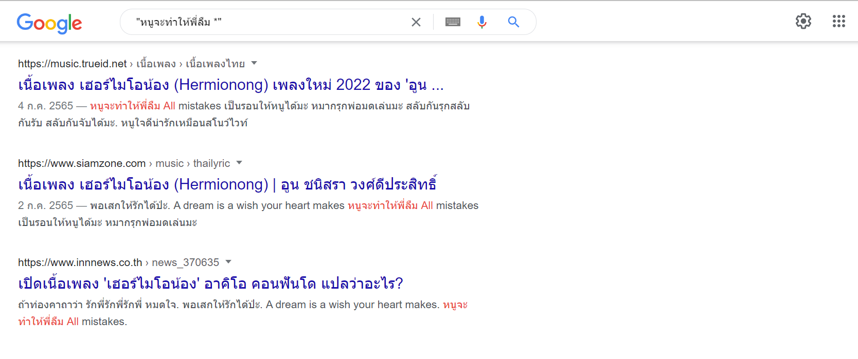 อาจจะใช้ในเวลาเรานึกชื่อหรือเนื้อเพลงบางจุดไม่ออก เช่น “หนูจะทำให้พี่ลืม *” คำค้นหาก็จะแม่นยำในส่วนที่เราค้นหา