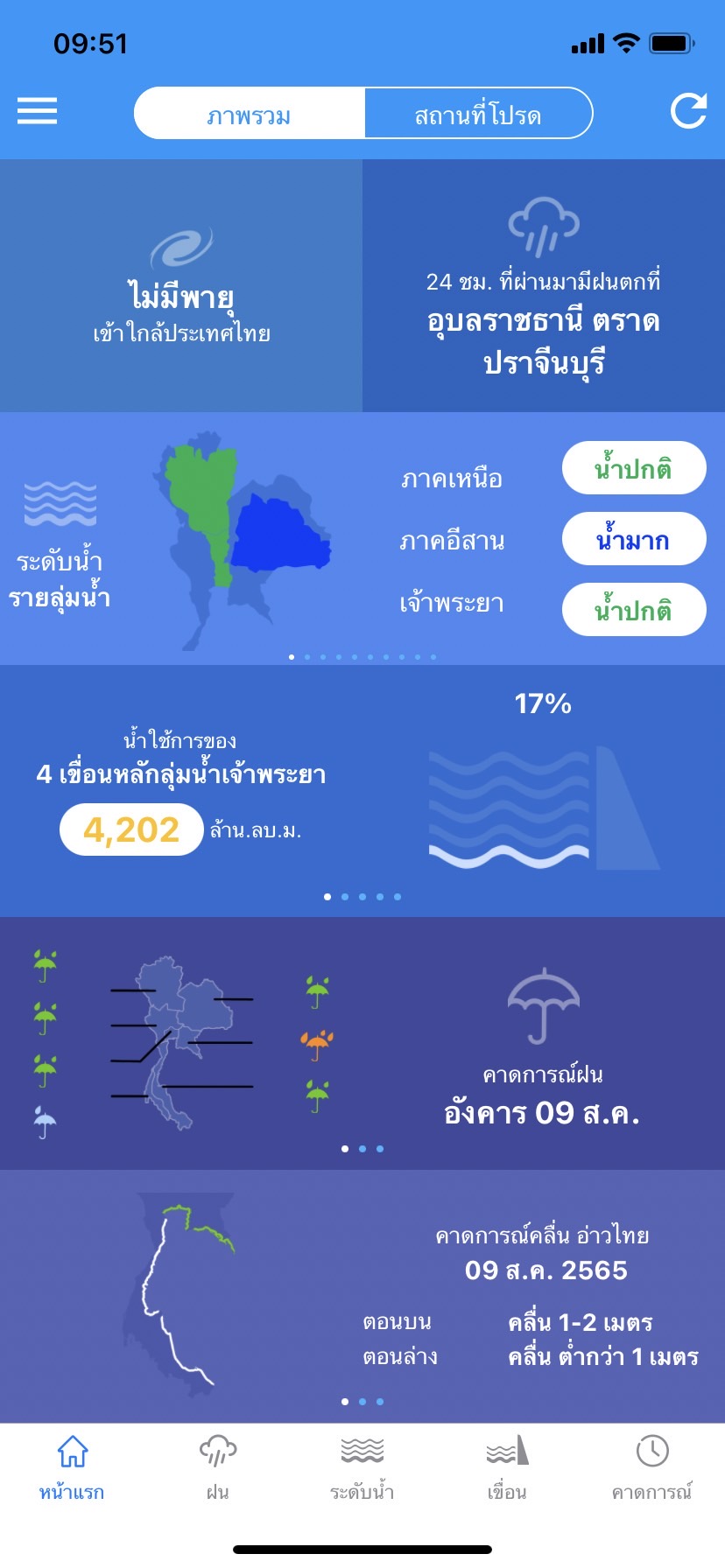 แอปพลิเคชั่นรายงานสถานการณ์อากาศและน้ำของประเทศไทย ซึ่งใช้ข้อมูลจากคลังข้อมูลน้ำแห่งชาติ ในแอปพลิเคชั่นจะรายงานเรื่องสภาพอากาศในภาพรวม มีพายุหรือไม่มี ปริมาณน้ำในแต่ละจังหวัดเป็นอย่างไร มีการคาดการณ์ของฝนที่จะตกในแต่ละวันด้วย นอกจากนี้ในหัวข้อ “ฝน” แจ้งเกี่ยวกับระดับน้ำฝนในแต่ละพื้นที่ทั่วประเทศไทย โดยแบ่งเป็นระดับสีจากแดงไปเขียวอีกด้วย นอกจากระดับฝนแล้วยังแจ้งมีระดับน้ำในแต่ละพื้นที่ว่ามีน้ำล้นตลิ่ง น้ำมาก หรือน้ำปกติ ในหัวข้อ “ระดับน้ำ” ส่วนหัวข้อ “เขื่อน” จะแจ้งข้อมูลระดับการที่กักเก็บและระดับน้ำที่ใช้จากเขื่อนต่าง ๆ อีกดเวย ถือว่าแอปพลิเคชั่นที่ช่วยให้เราคาดการณ์สถานการณ์น้ำท่วมได้ทันท่วงที