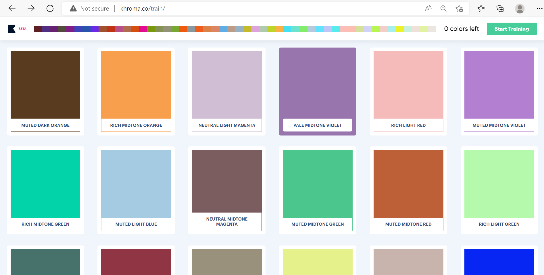 เริ่มด้วยการเลือกสีที่เราต้องการหรือสีที่ชอบไว้ก่อน 50 สี เชื่อเถอะว่า 50 สีนี่ไม่เยอะเลย ถ้าเทียบกับสีที่เขามีให้ ! หากต้องการเอาสีออกก็แค่คลิกที่สีนั้นอีกรอบ เมื่อเลือกครบให้กด start training จากนั้นเว็บก็จะสร้างคู่สีให้เราให้อัตโนมัติ แถมยังมีรูปแบบตัวอย่าง หรือรูปแบบการไล่สีให้เราดูอีกด้วย ง่าย ๆ แค่นี้ ใครมีปัญหาด้านการเลือกสี ต้องใช้เลย !