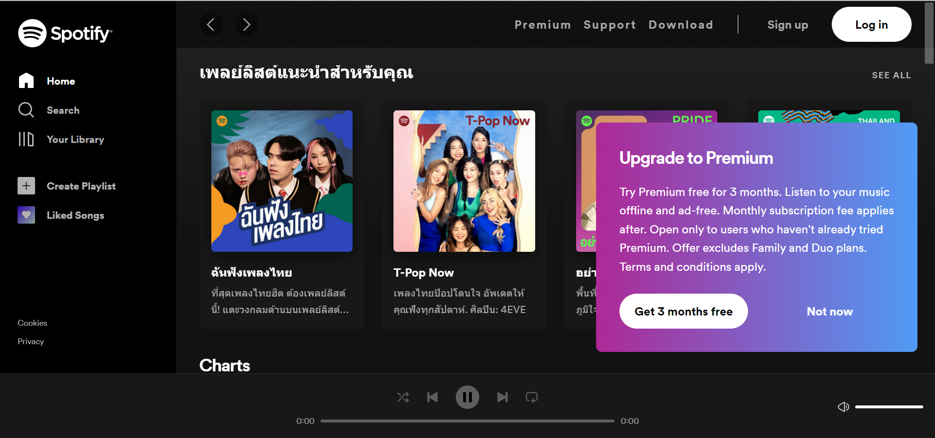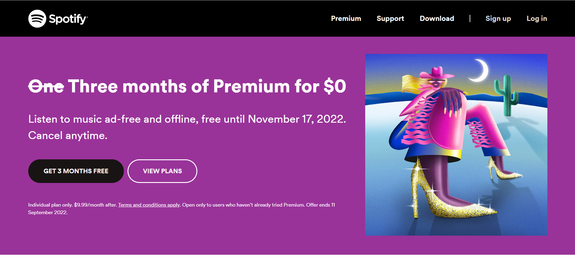 Spotify ยืดอายุการทดลองใช้แอปแบบพรีเมียมนานถึง 3 เดือน จากเดิม 1 เดือน สำหรับผู้ใช้รายบุคคล ซึ่งปกติต้องเสียค่าสมาชิก 129 บาท/เดือน และผู้ใช้งานกลุ่มนักเรียนนักศึกษาที่ต้องจ่าย 65 บาท/เดือน