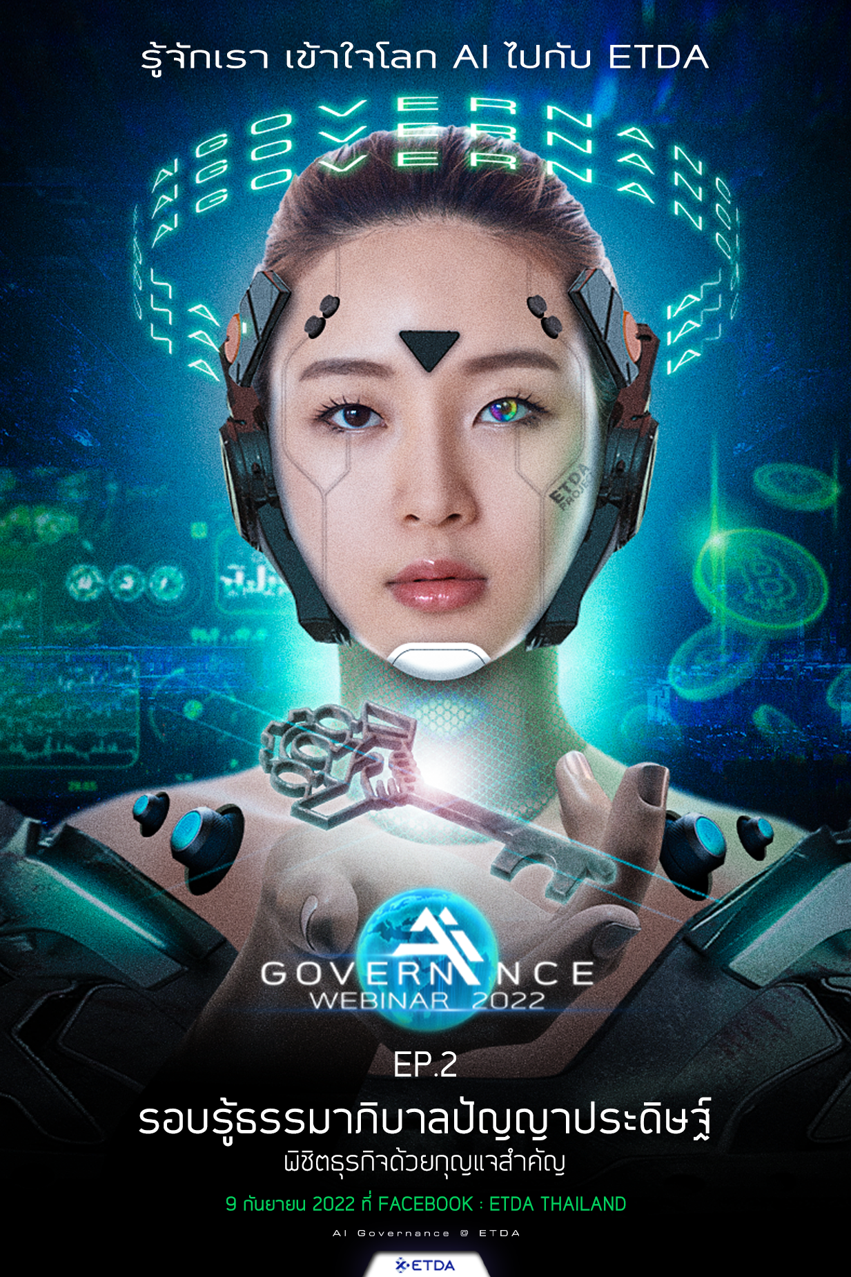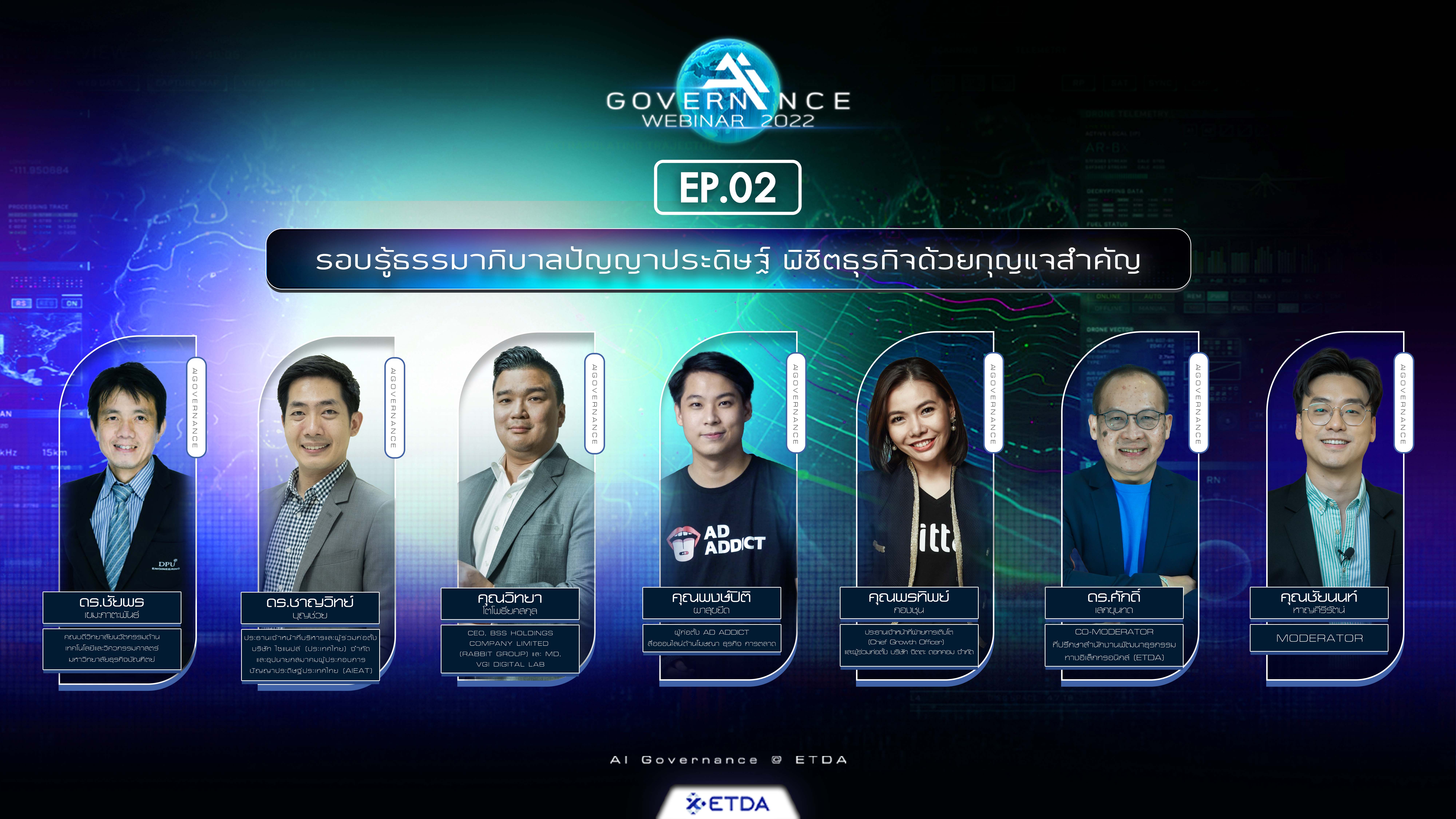 ดังนั้น  AI Governance Webinar 2022  EP.02 นี้ ETDA จึงจัดขึ้นในหัวข้อ EP.02 “รอบรู้ธรรมาภิบาลปัญญาประดิษฐ์ พิชิตธุรกิจด้วยกุญแจสำคัญ ในวันที่ 9 กันยายน 2565 เวลา 13:00 – 16:00 . ผ่านทาง Zoom และไลฟ์สดผ่านทางเพจ Facebook ETDA Thailand เพื่อพาองค์กร ธุรกิจและคนที่สนใจ ไปร่วมพิชิตการทำงานและการทำธุรกิจ ด้วยการประยุกต์ใช้ AI ได้อย่างมีจริยธรรมและธรรมาภิบาล ทั้งในมุมของการพัฒนาองค์กร การทำการตลาดด้วยข้อมูล สู่การสร้างยอดขายและรายได้อย่างยั่งยืน ผ่านการแลกเปลี่ยนมุมมองจากผู้เชี่ยวชาญด้าน AI และธุรกิจ นำโดย  ดร. ศักดิ์ เสกขุนทด  ที่ปรึกษา ETDA, ดร.ชัยพร เขมะภาตะพันธ์ คณบดีวิทยาลัยนวัตกรรมด้าน เทคโนโลยีและวิศวกรรมศาสตร์ มหาวิทยาลัยธุรกิจบัณฑิตย์, ดร. ชาญวิทย์ บุญช่วย อุปนายกสมาคมผู้ประกอบการปัญญาประดิษฐ์ประเทศไทย (AIEAT) ประธานเจ้าหน้าที่บริหารและผู้ร่วมก่อตั้ง บริษัท ไซแนปส์ (ประเทศไทย), คุณวิทยา โตโพธิ์ยศสกุล CEO BSS Holdings Company Limited (Rabbit Group) และ MD VGI Digital Lab พร้อมด้วย คุณพงษ์ปิติ ผาสุขยืด        ผู้ก่อตั้ง Ad Addict สื่อออนไลน์ด้านโฆษณา ธุรกิจ การตลาด และดำเนินรายการโดย คุณฉัตรปวีณ์ ตรีชัชวาลวงศ์ และคุณชัยนนท์ หาญคีรีรัตน์
